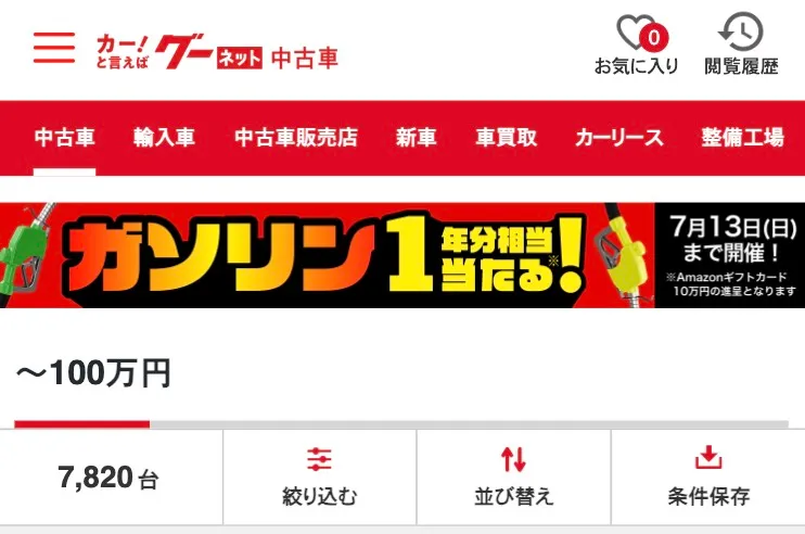 たとえば、中古車情報サイトのグーネットにて、「100万円以下」「2020年〜2025年式」「走行距離5万km以下」「修復歴なし」の条件で検索すると、8,000台近い中古車がヒットします。