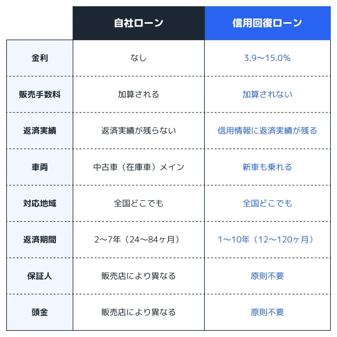 一方の信用回復ローンとは、ブラック向けに提供されているマイカーローンサービスです。一般的なマイカーローンよりも金利は高めですが、審査に通りやすく、信用情報がブラックでもローンを組んで車を買うことができます。