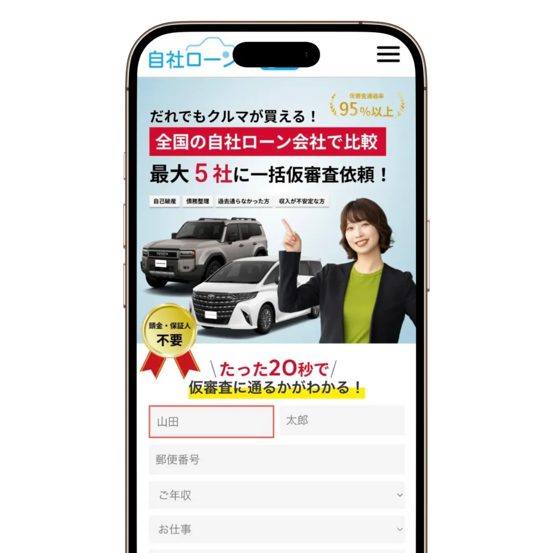 一般的なマイカーローンの審査に通らず、車を買えずに困っている人はまず自社ローンの窓口を利用しましょう。1分ほどの申し込みで、マイカーを手に入れるための一歩を踏み出してみてください。