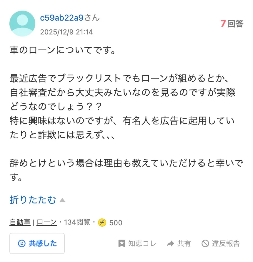 車のローンについてです。最近広告でブラックリストでもローンが組めるとか、自社審査だから大丈夫みたいなのを見るのですが実際どうなのでしょう??特に興味はないのですが、有名人を広告に起用していたりと詐欺には思えず、、、辞めとけという場合は理由も教えていただけると幸いです。(Yahoo!知恵袋より)