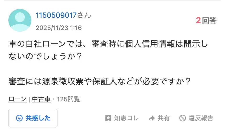 車の自社ローンでは、審査時に個人信用情報は開示しないのでしょうか?審査には源泉徴収票や保証人などが必要ですか?(Yahoo!知恵袋より)