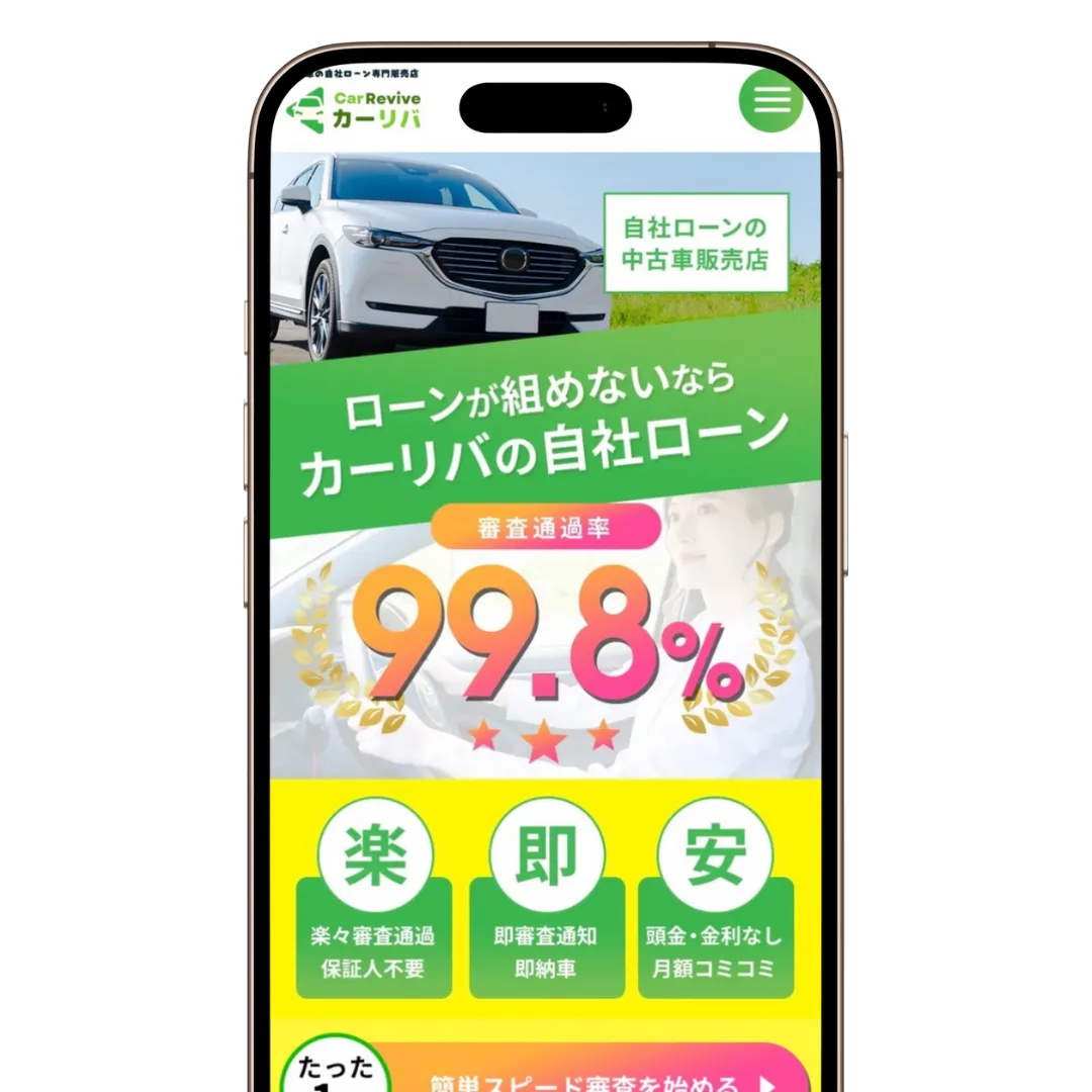 カーリバの審査通過率は99.8%と非常に高く、1,000人中998人が審査に通っていることになる。審査通過率が95〜98%の自社ローンは多いが、審査通過率99.8%との差は雲泥の差です。