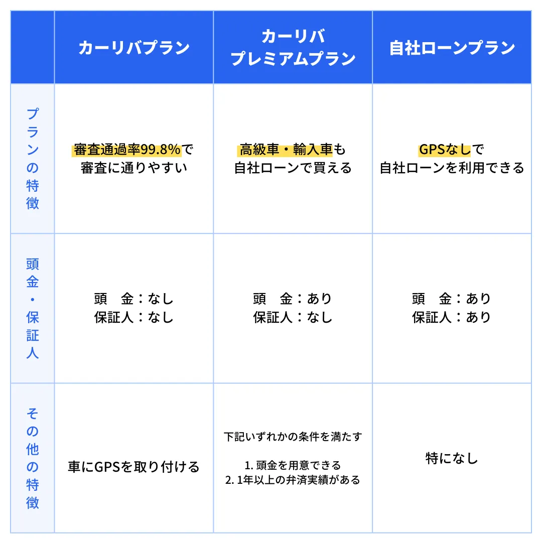したがって、オトロンや自社ローンの窓口の審査に落ちてしまったときの最終手段として、カーリバを検討してみましょう。また、カーリバでは「頭金を用意できる」「1年以上の弁済実績がある」のどちらかの条件をクリアすると、高級車を購入できるカーリバプレミアムプランを利用できます。