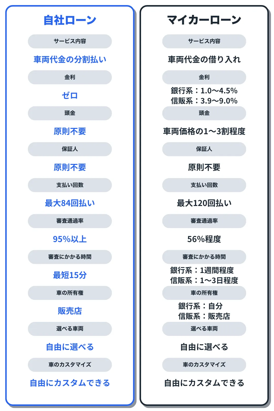 マイカーローンの方が支払い総額は安いが、審査基準が高く、審査に落ちる可能性があります。一方、自社ローンは支払い総額こそ高いが、審査基準が甘くブラックでも審査に通り車を買える可能性があります。