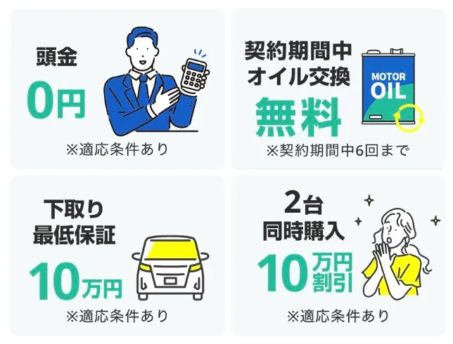 オイル交換無料特典だけでも、18,000〜30,000円ほどお得に利用できます。ここまで特典が多い自社ローンも珍しいため、もはや中古車の値引き交渉が不要なくらいです。