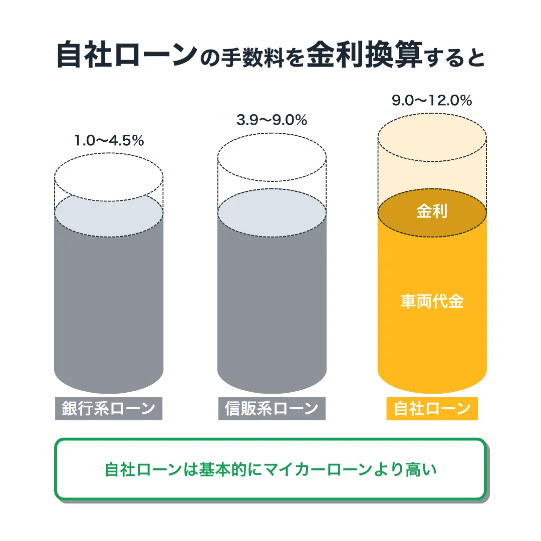 具体的には、自社ローンは金利9.0〜12.0%相当の返済総額になるケースが多く、これがマイカーローンなら高金利な部類に入ります。