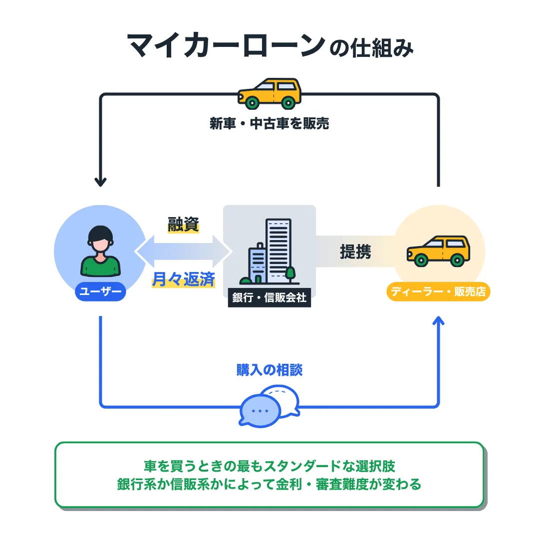 車を買うときの選択肢としては、銀行や信販会社のマイカーローンを利用するのが一般的です。車両代金を銀行や信販会社から借り入れ、金利に応じた利息を上乗せした金額を毎月返済していきます。