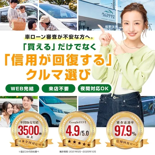 クルマテラスは、一般的なマイカーローンの審査に通らない人を対象とした「信用回復ローン」だ本来ならマイカーローンの審査に通らないブラック(信用情報の傷がある人)も、クルマテラスなら審査に通り、希望の車を手に入れられる可能性があります。