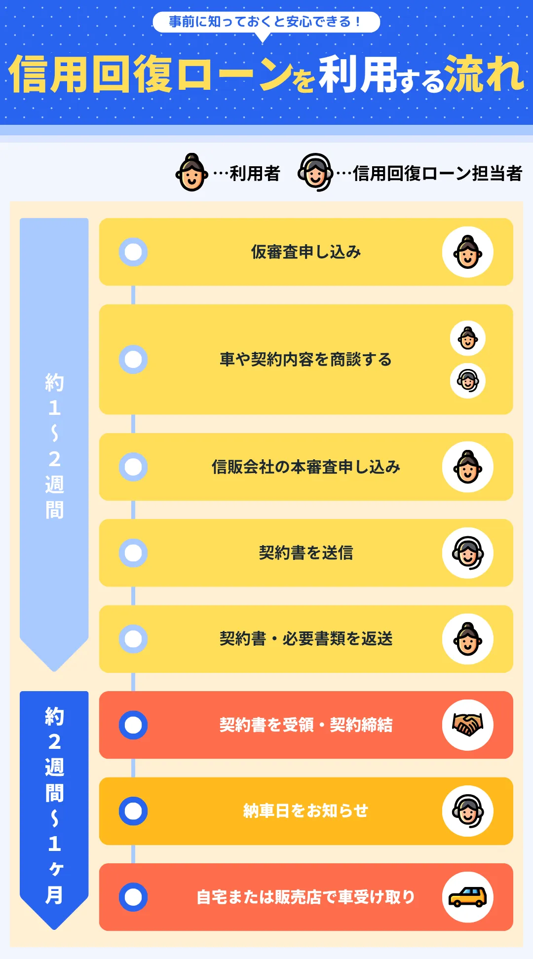 クルマテラスでの返済が完了する頃には信用情報からブラックが消え、「毎月の返済をしっかりと行ってきた」という実績まで残せる。これが、クルマテラスで信用を回復できる仕組みです。
