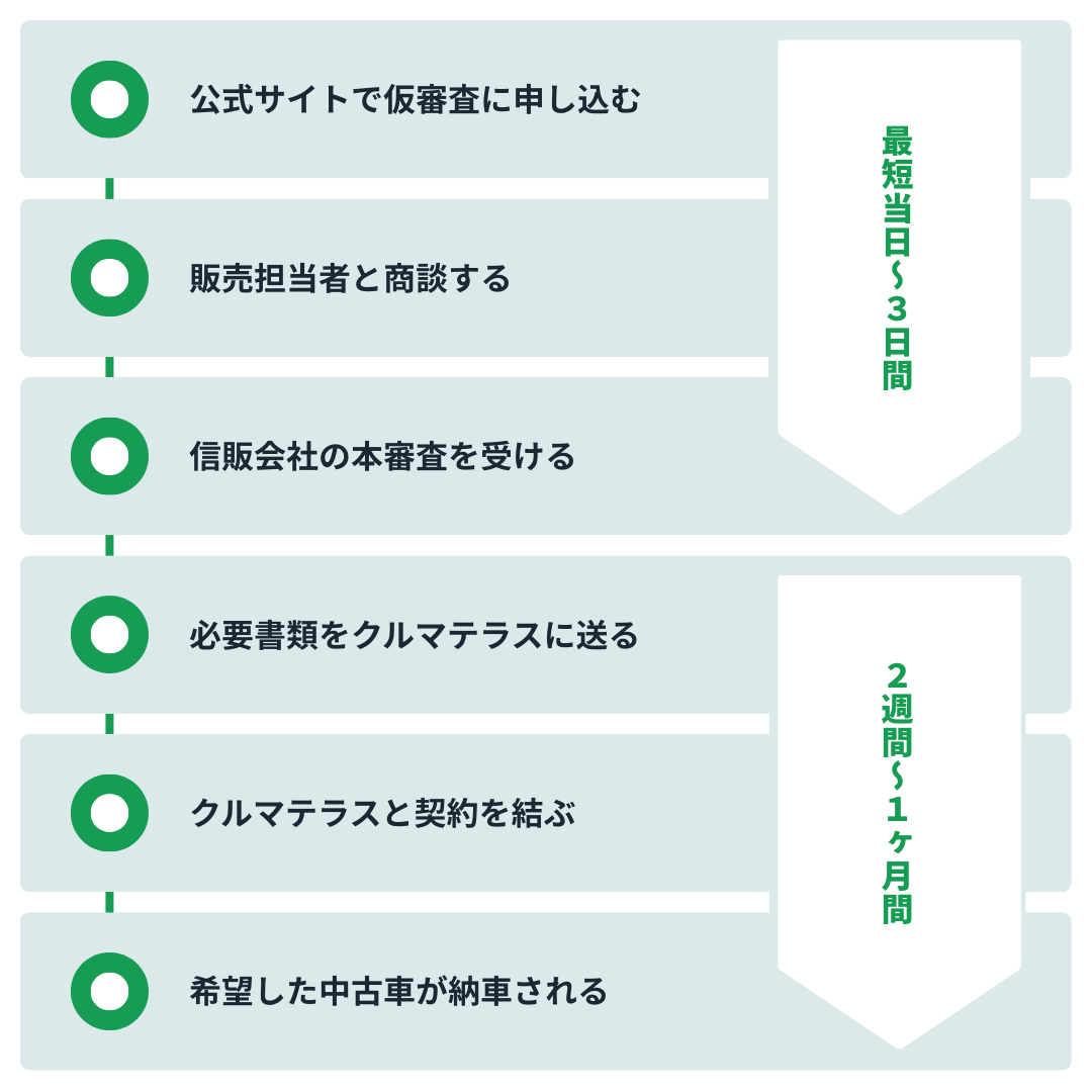 クルマテラスは実店舗だけでなく、公式サイトからの仮審査申し込みを受け付けています。申し込みは1分ほどで完了し、最短30分で審査が届きます。その後は販売担当者と商談し、信販会社の本審査を受けるのが一般的な流れです。