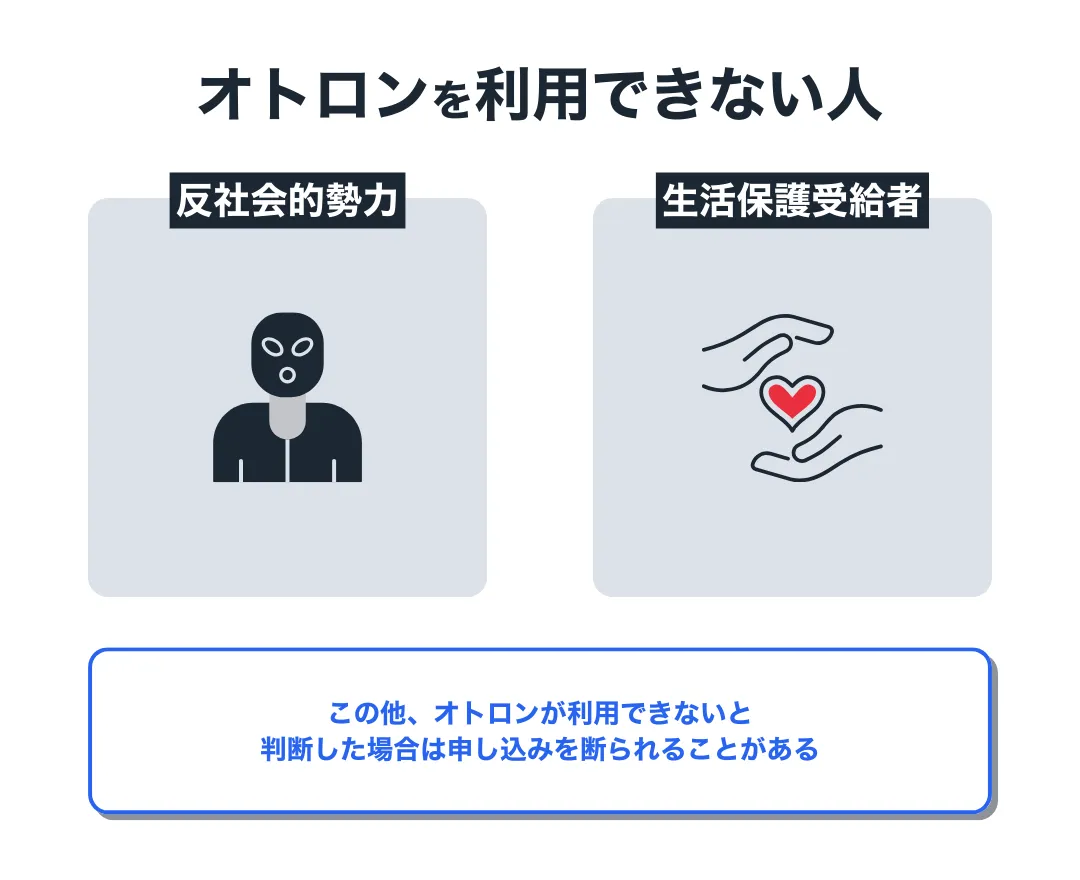 オトロンの審査ではまず本人確認を実施し、「反社会的勢力との関係はないか?」「生活保護を受けていないか?」をチェックします。オトロンではこれらに該当する人物は、自社ローンを利用することができません。