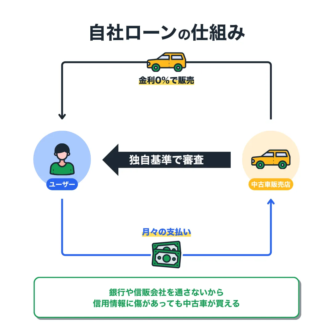 自社ローンとは、ユーザーと中古車販売店の直接契約によって提供される、車両代金の分割払いサービスです。