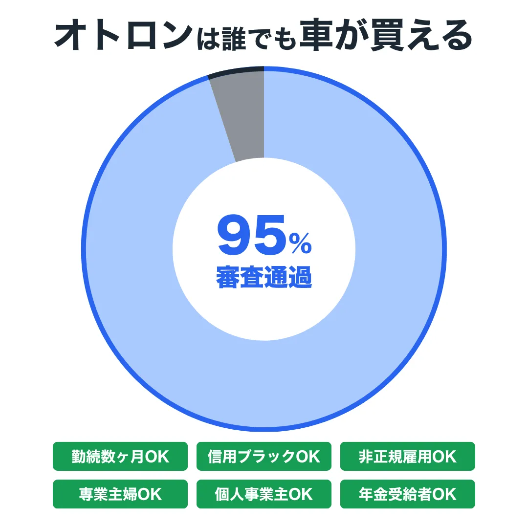 オトロンの自社ローンなら、マイカーローンの審査に落ちた人でも車が買える。審査通過率は95%以上と非常に高く、100人中95人がオトロンで念願の車を手に入れています。